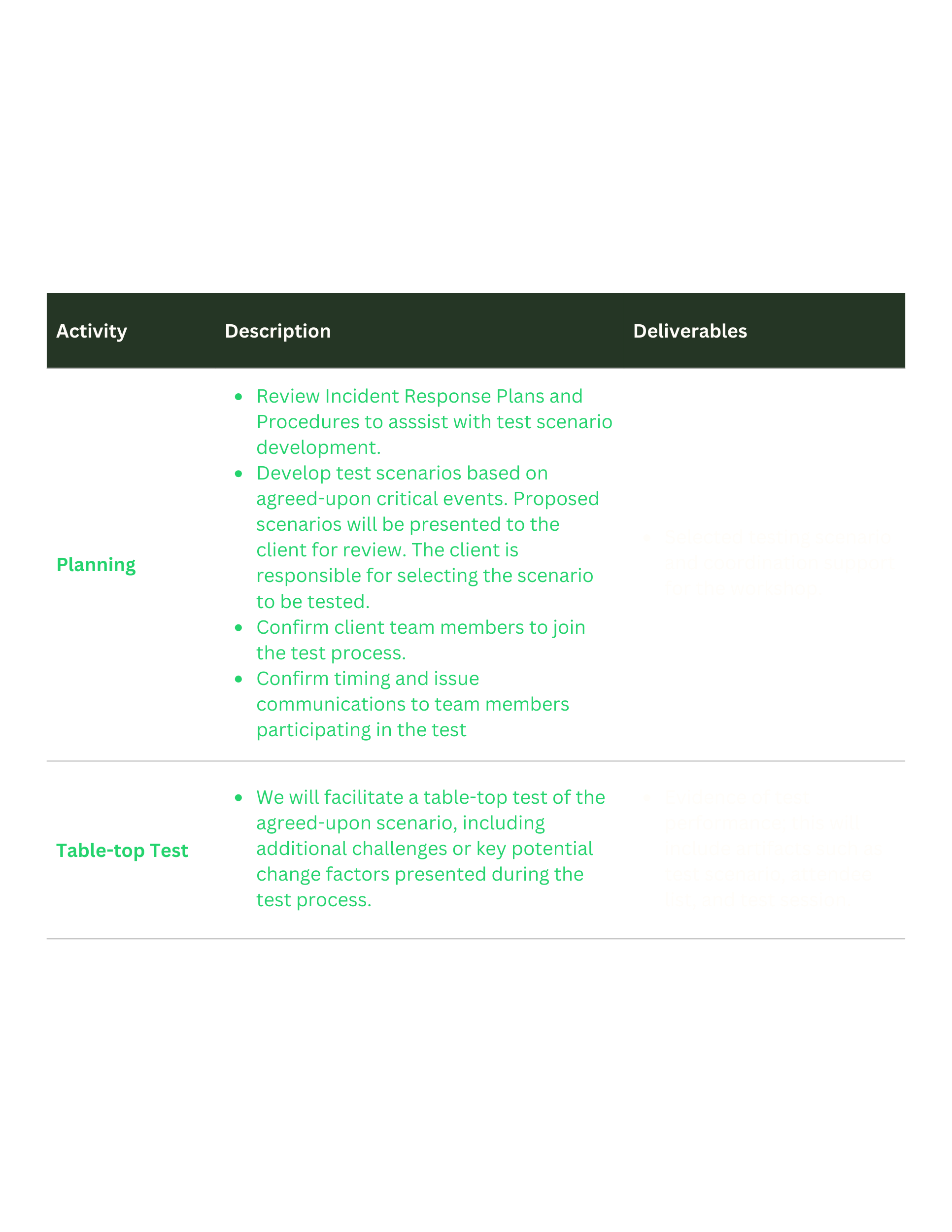 This table-top workshop is structured to allow a Client to thoroughly test its incident response (IR) plan design and effectiveness. The working session structure also facilitates training, awareness, and business impact understanding beyond the specific test itself.