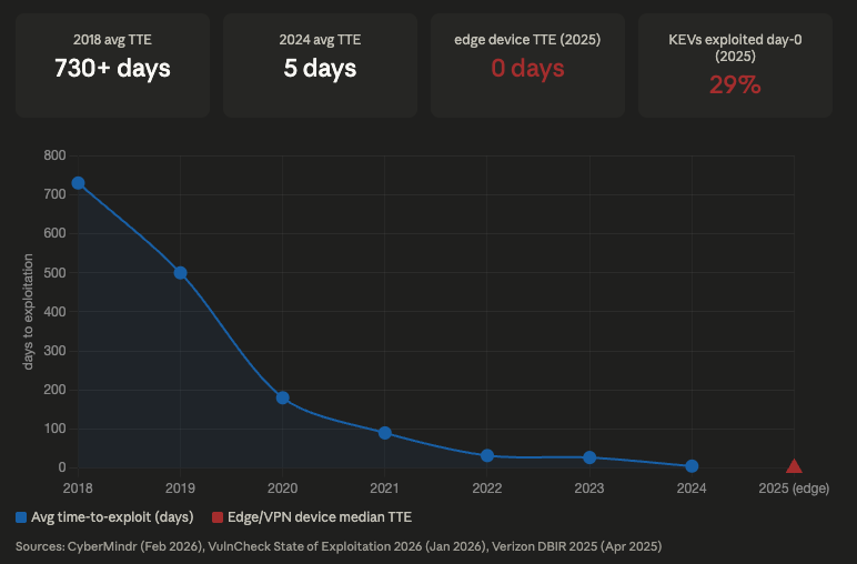 Time-to-Exploit (TTE) compression, 2018–2025 Sources: CyberMindr (Feb 2026) CyberMindr, VulnCheck State of Exploitation 2026 (Jan 2026) VulnCheck, Verizon DBIR 2025 analysis (Dec 2025) ColorTokens