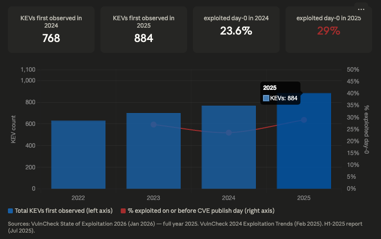Known Exploited Vulnerabilities (KEVs) volume and day-0 exploitation rate, 2022–2025 VulnCheck's State of Exploitation 2026 (Jan 2026) identified 884 KEVs first observed in 2025, with 28.96% exploited on or before their CVE publication date, up from 23.6% in 2024. VulnCheck The 1H-2025 interim report confirmed the trend was accelerating mid-year, with 32.1% of KEVs showing exploitation evidence on or before CVE issuance. VulnCheck